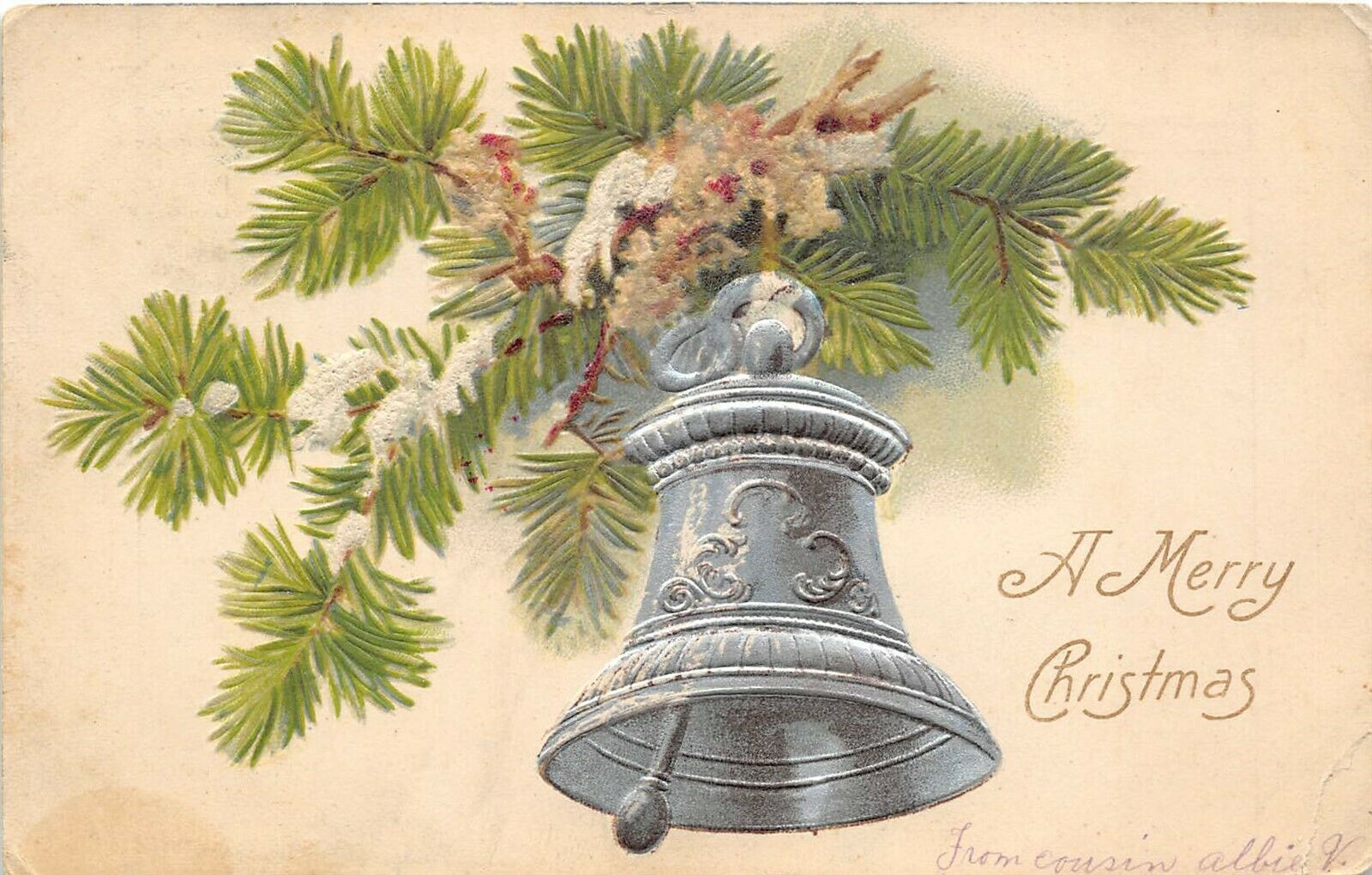 Merry Christmas 1906 Undivided Back Embossed Postcard Silver Bell Pine