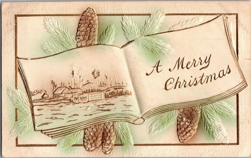MERRY CHRISTMAS c1910 Embossed Airbrushed Postcard Open Book Pine Cones KJ9