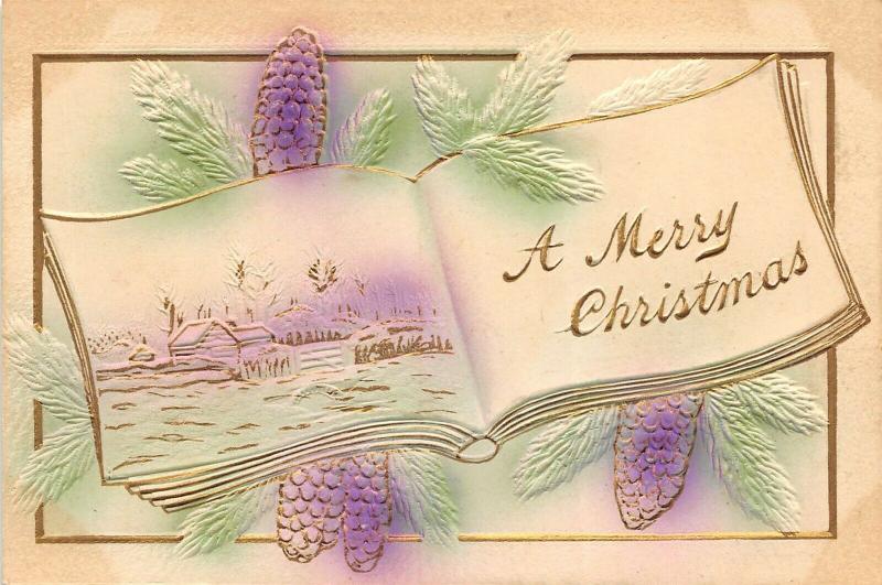 MERRY CHRISTMAS c1910 Embossed Airbrushed Postcard Open Book Pine Cones.. Ohio residents add 7.25% sales tax. If purchasing multiple items wait for a combined invoice before paying. Powered by SixBit's eCommerce Solution