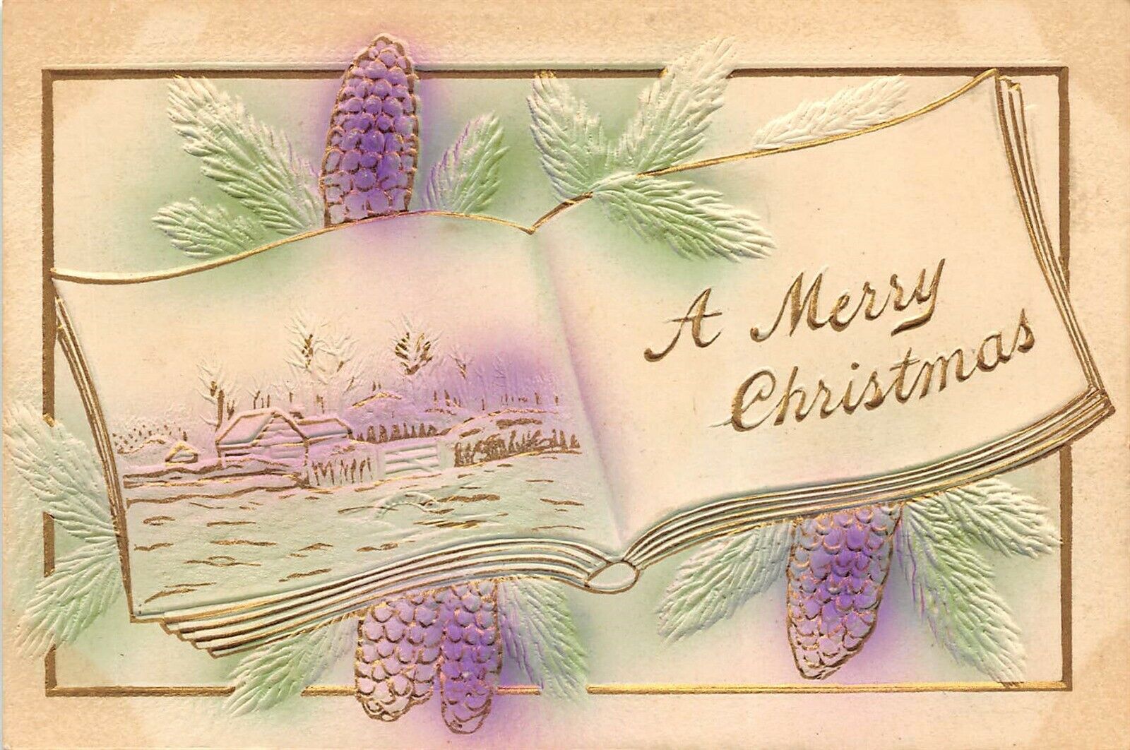 MERRY CHRISTMAS c1910 Embossed Airbrushed Postcard Open Book Pine Cones