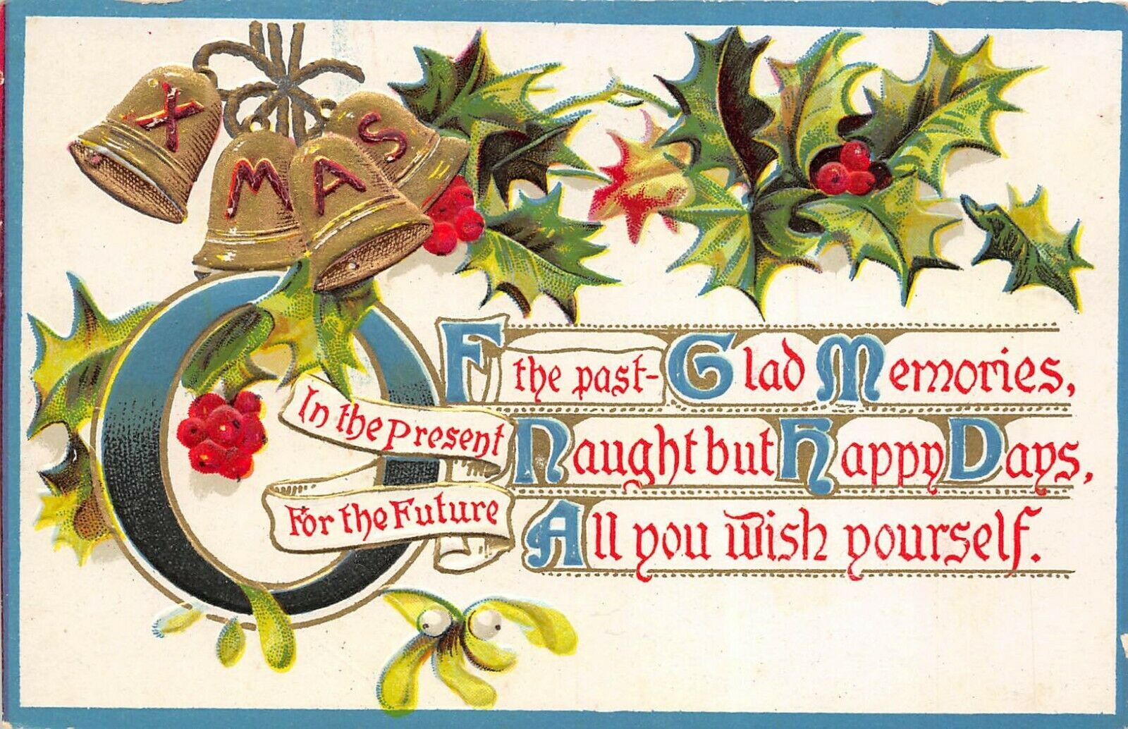 MERRY CHRISTMAS c1910 Embossed Postcard XMAS Bells and Holly
