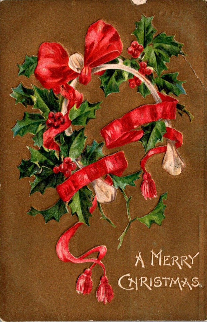 Merry Christmas With Red Ribbon and Holly 1908