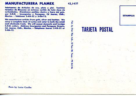 Mexico - Juarez. Manufacturera Plamex --- M, UN, DB, C Grading of Postcards MINT (M): Perfect condition, no apparent blemishes, flaws, postally unused, may have some writing on back. NEAR MINT (NM): Like new, imag ... Read More