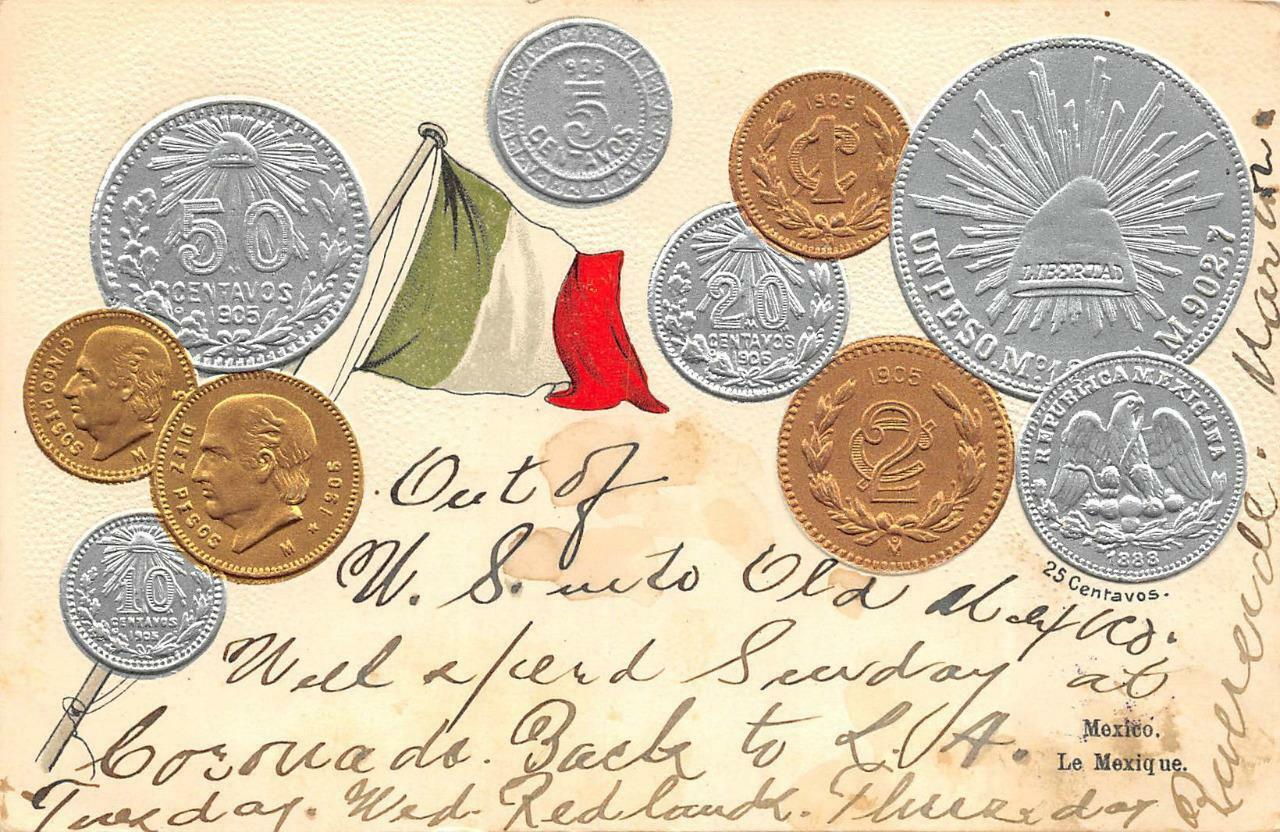 MEXICO SILVER & GOLD COINS FLAG EMBOSSED PATRIOTIC POSTCARD (c. 1908)