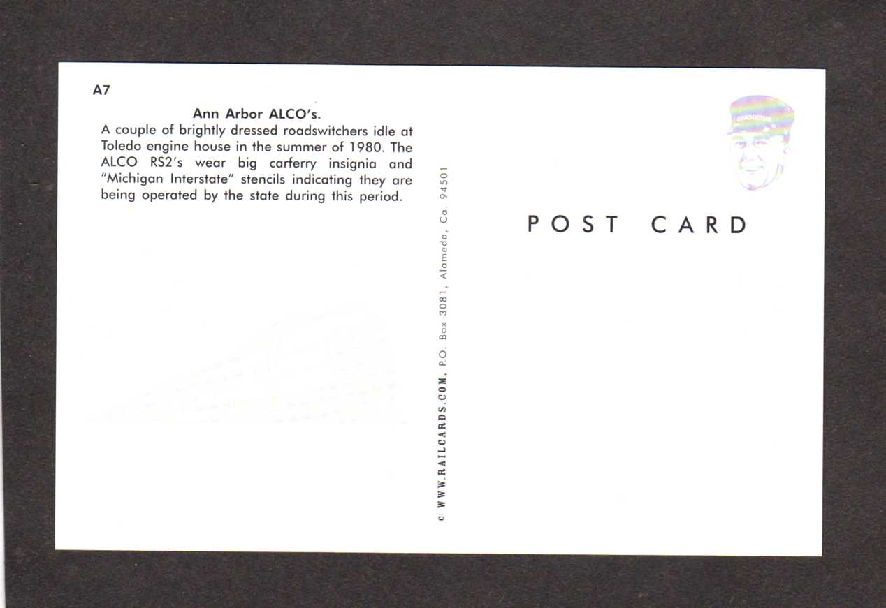 MI Ann Arbor Railroad Train System Engine Railway Michigan Postcard Alco Lot Details This is a Standard sized post card ( 3 1/2" by 5 1/2") with light corner and edge wear. Postally unused postcard. (PC-5536) (see ... Read More