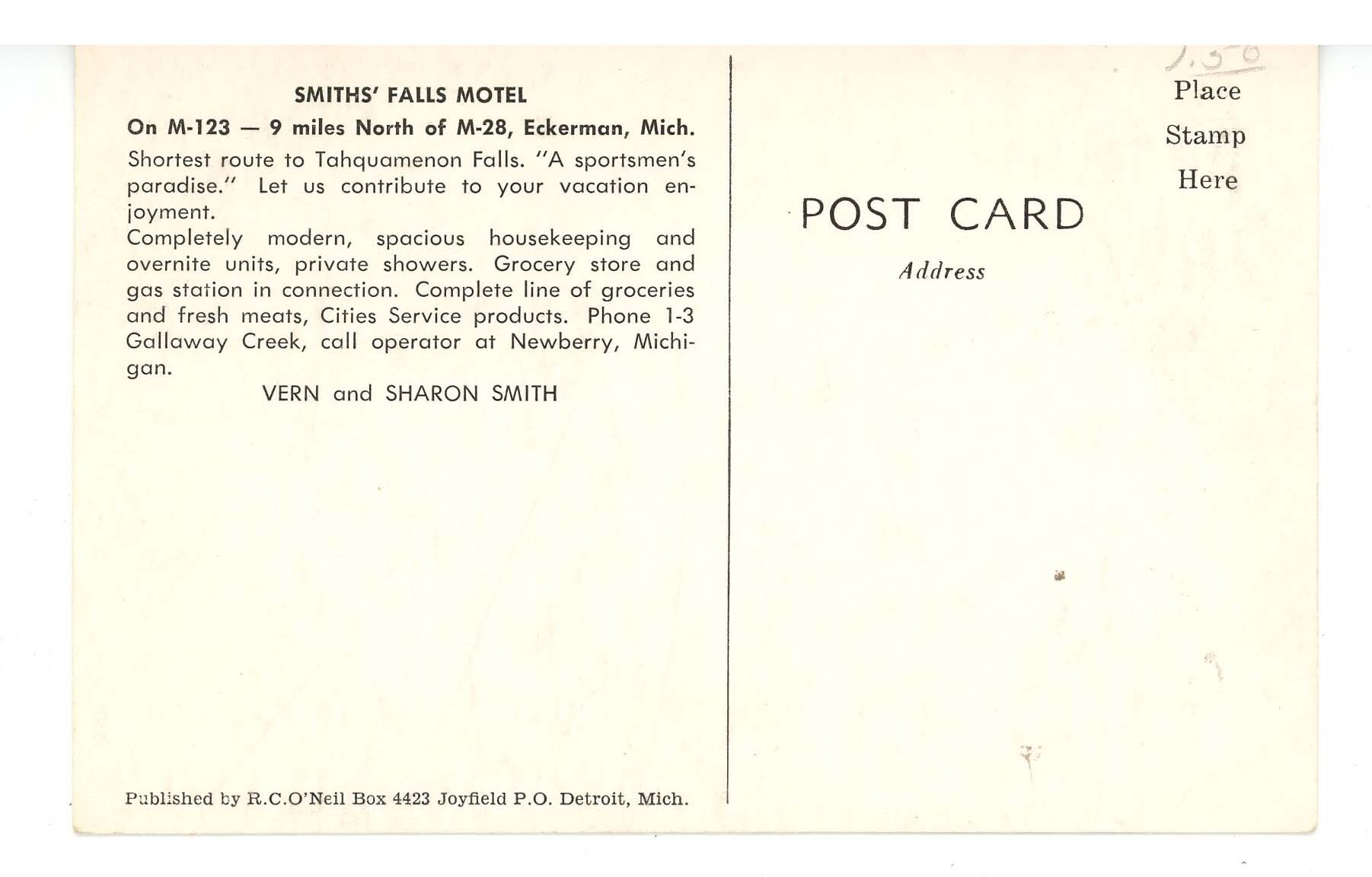 MI - Eckerman. Smith Falls Motel & Cities Service Gas Station ca 1957