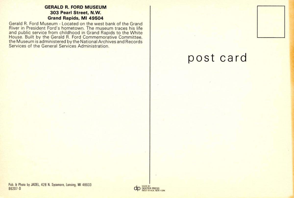 MI - Grand Rapids. Gerald R Ford Museum Grading of Postcards MINT (M): Perfect condition, no apparent blemishes, flaws, postally unused, may have some writing on back. NEAR MINT (NM): Like new, image is uncompromi ... Read More