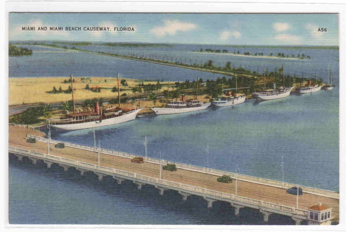 Description: Miami Beach Causeway Ships Florida linen postcardType: linen postcard.