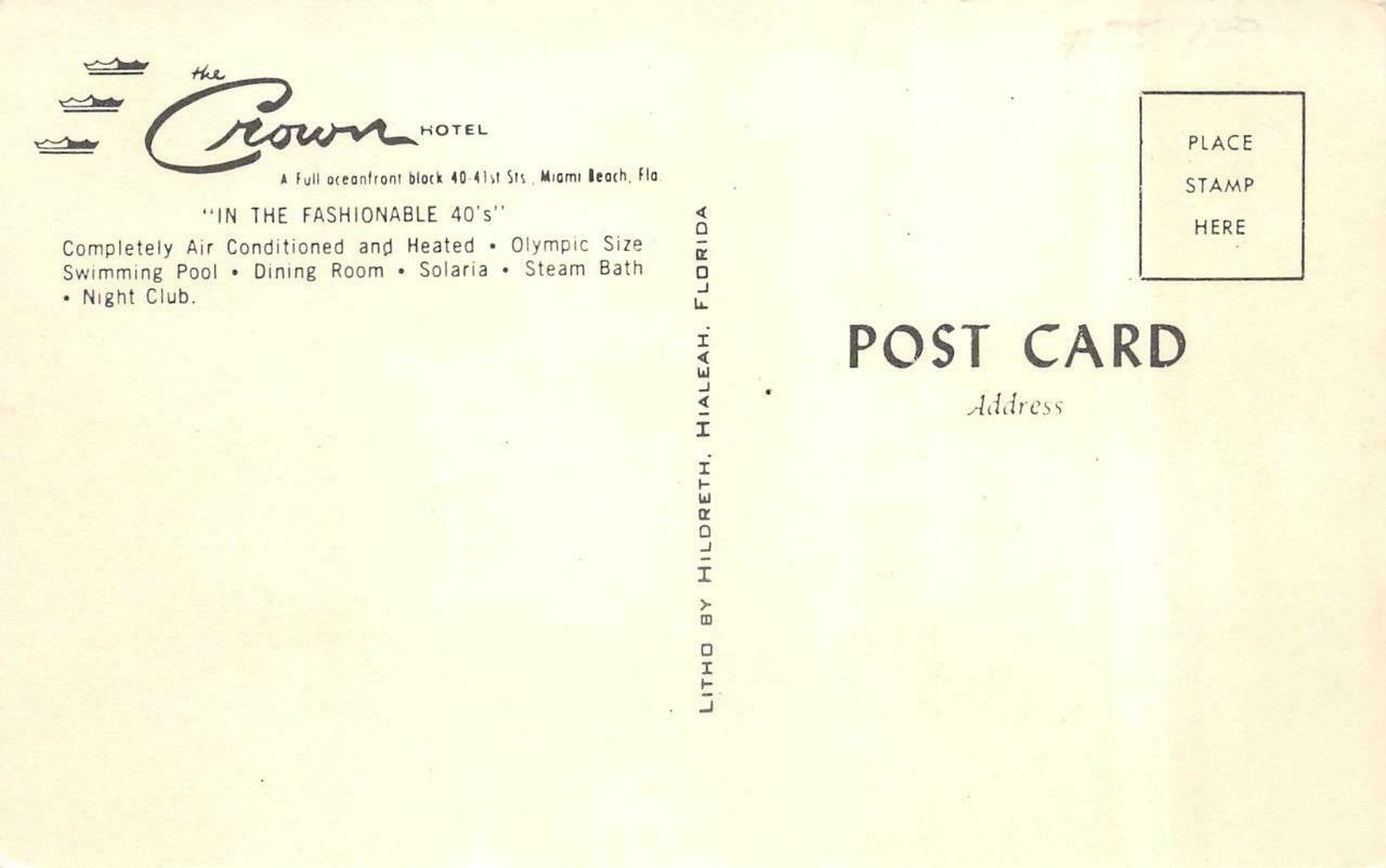 MIAMI BEACH, FL Florida CROWN HOTEL Pool ROADSIDE c1950's Chrome Postcard MIAMI BEACH, FL Florida CROWN HOTEL Pool ROADSIDE c1950's Chrome Postcard Click images to enlarge Description Please note that if in the image of the postcard back, an odd colored shadow appears on one side, it is a scanner defect and it does not appear on the card. Item is described as accurately as possible. Please View My Other Items For Sale and be sure to Add me to your Favorite Sellers. Please be sure to Visit My Hip Store, new items are listed every week. Please don't hesitate to send me a question, before or after your purchase. I want to make sure your experience is a positive one, and will respond promptly to all inquiries. I only sell standard size vintage postcards, shipped typically within 24 hours, in a cardboard stiffened envelope. I offer a full refund if you are unhappy with your purchase, so please buy with confidence. Get images thatmake Supersized seem small.Showcase your items with Auctiva'sListing Templates!THE simple solution for Hip sellers.Track Page Views WithAuctiva's FREE Counter