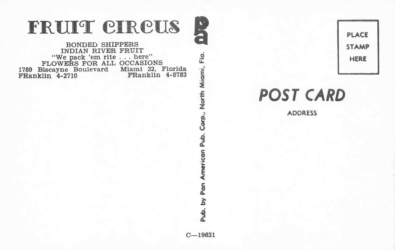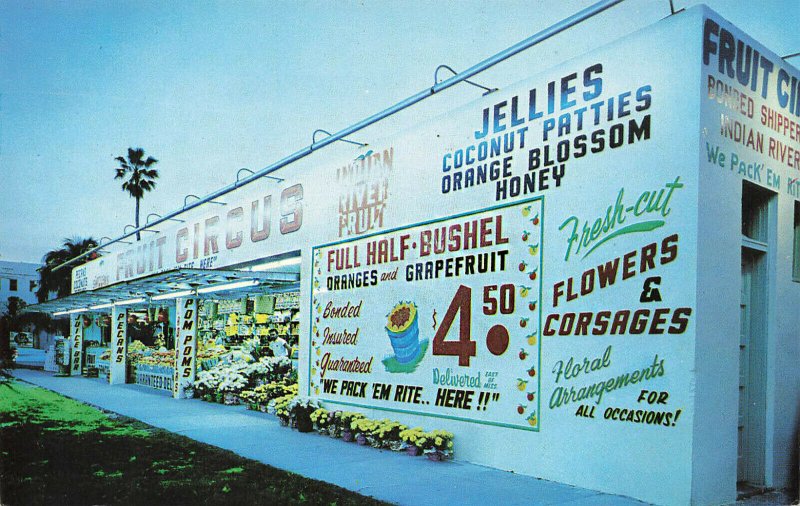 Miami fl "fruit circus" indian river fruit signage, postcard.