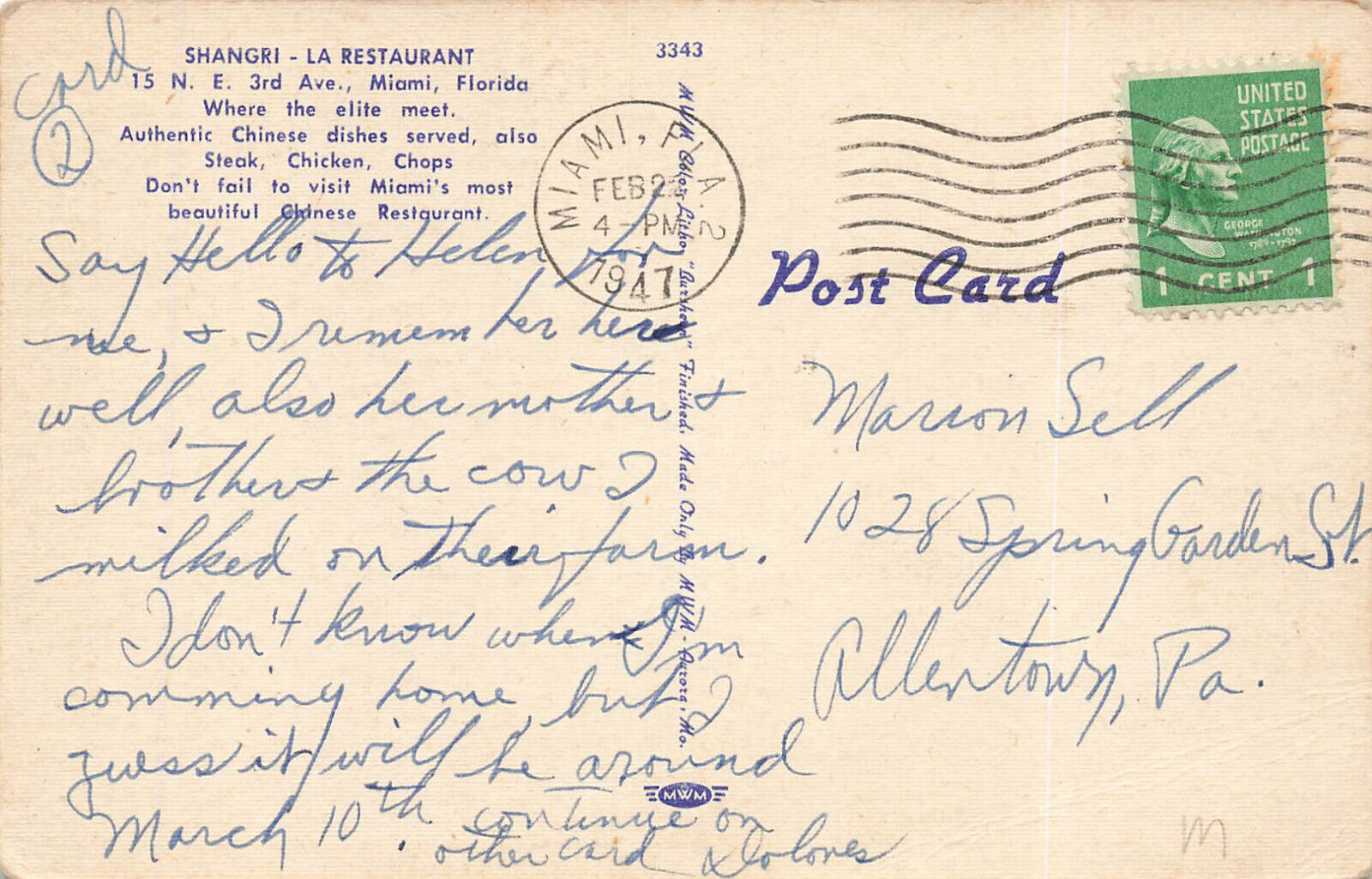 Miami fl shangri-la restaurant interior view, linen postcard.
