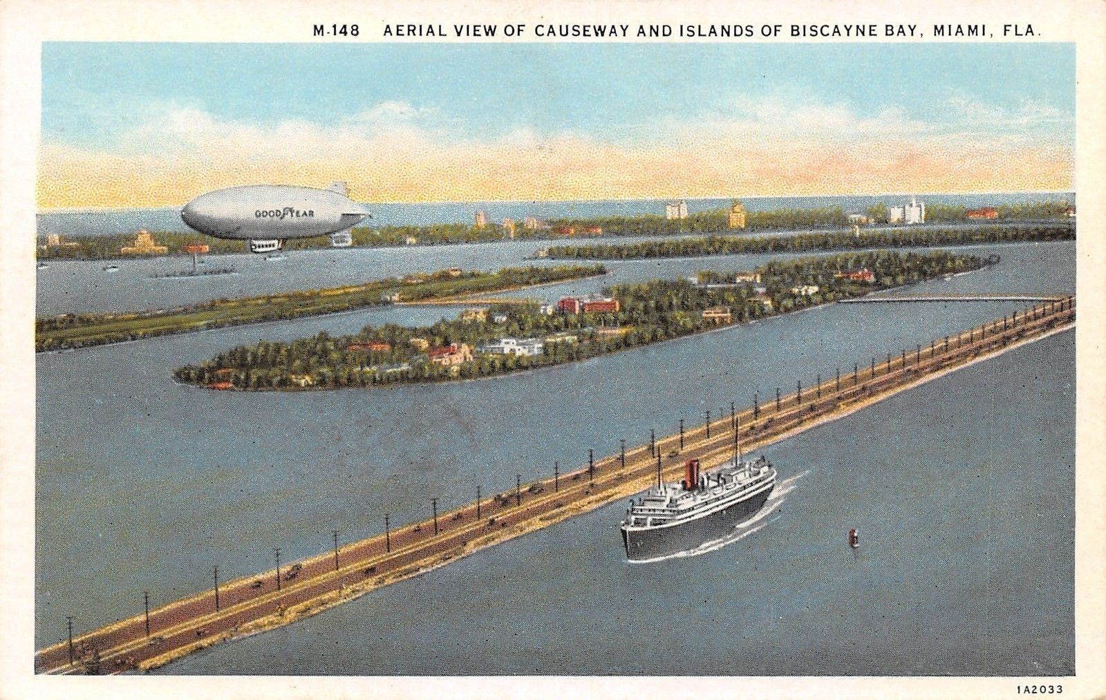Miami Florida~Goodyear Blimp~Dirigible View Causeway~Ship~Biscayne Bay~1931 PC