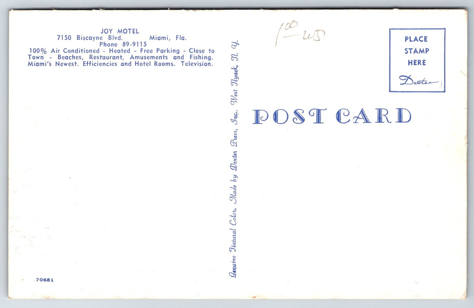 Miami Florida~Joy Motel~Round Office~1950s Cars~Postcard