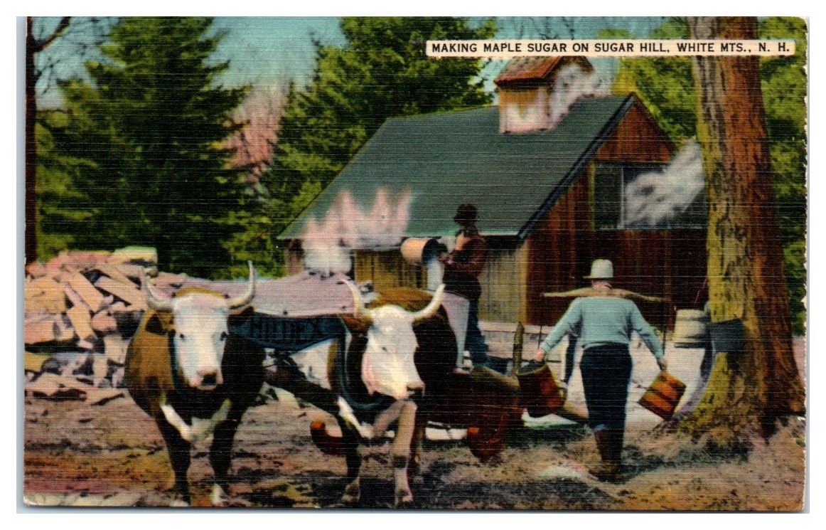 I have for sale one Mid-1900s Making Maple Sugar on Sugar Hill, White Mountains, NH Postcard.