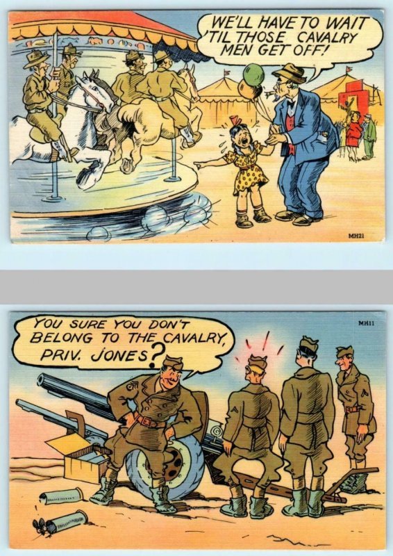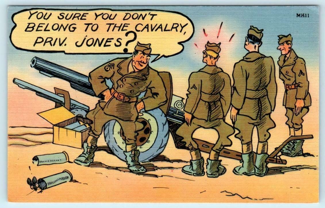 MILITARY COMIC ~ WWII Era CAVALRY MERRY GO ROUND c1940s Linen Postcard