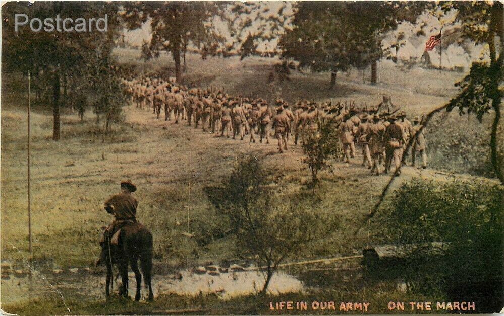 Printed Postcard Life in the Army, On The March Publisher/Printer: H.H. Stratton Postmark: None Image: Nice and clean Corners: Wear Faults/Other: Crease bottom left corner