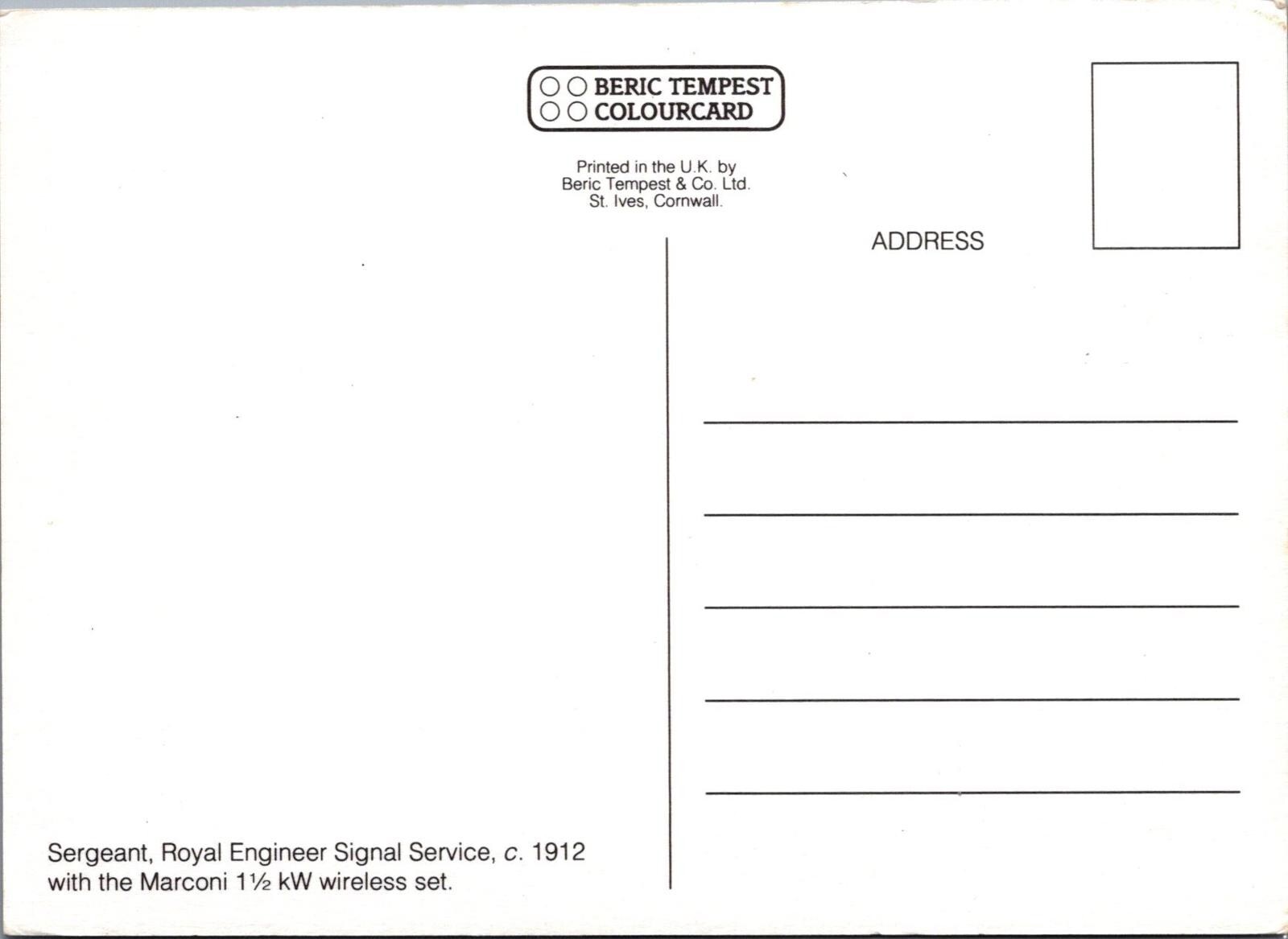 Military Postcard - Sergeant, Royal Engineer Signal Service c1912 - RR23465Publisher: Beric TempestPostcard size: ContinentalPostcard defect(s): Slight corner rubbing Please also use the image magnifier to make your own assessment on the condition. Please ignore any lines caused by the scanner.When possible all of our postcards will be posted to you inside a collectable plastic postcard sleeve and a board backed envelope which will be marked 'Please do not bend'.Any 'Mo's Postcards' watermark does not appear on the actual postcard'.
