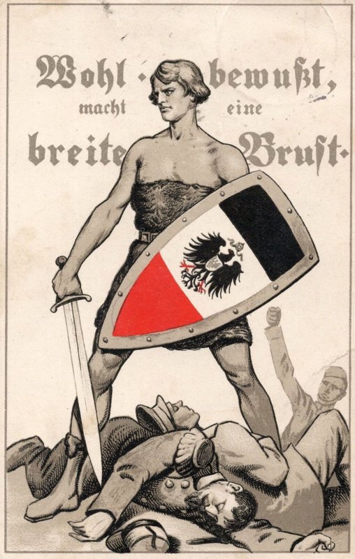 bg225 Antique WW1 German postcard which I know very little about as I cant translate but looks fascinating from 1915 showing a warrior with a German shield trampling on the dead with some ageing in places but very good condition indeed - reverse has a 1915 message so could be very interesting if someone can translate being a military souvenir.