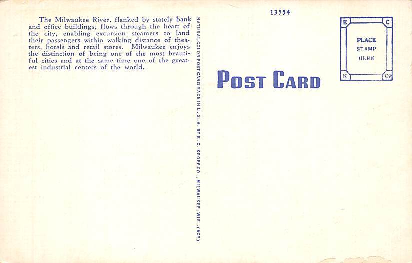 Milwaukee River North View - Milwaukee, Wisconsin WI Postcard - View Images Grade: 1 Size: R - Regular Size Postcard - approximately 3 1/2 inch x 5 1/2 inch (9 CM x 14 CM) Grading Scale: Grade 1 = Perfect corne ... Read More