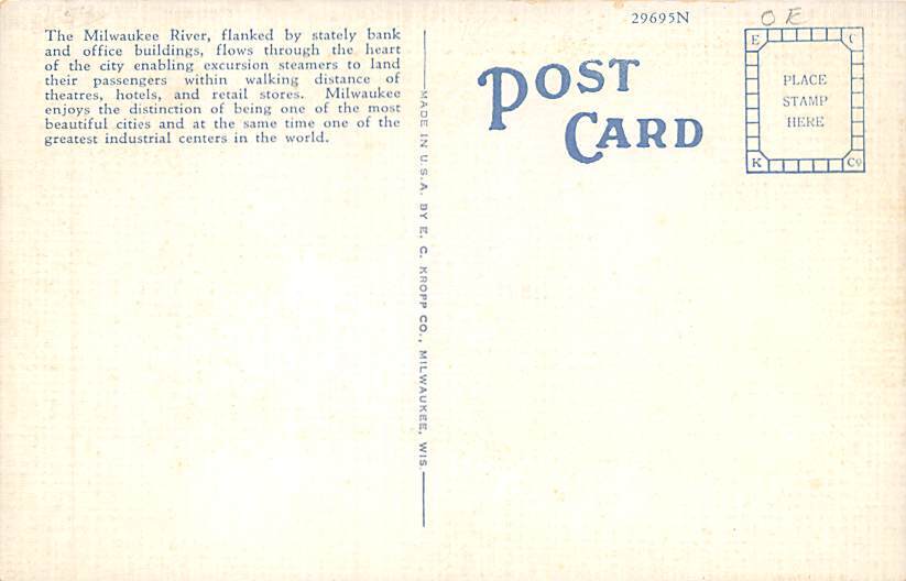 Milwaukee River View Milwaukee WI Grade: 2 Size: Regular Size Postcard - approximately 3 1/2 inch x 5 1/2 inch (9 CM x 14 CM) Grading Scale: Grade 1 = Perfect corners Grade 2 = Very Minimal corner wear, no crea ... Read More