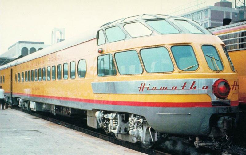 A postcard of the tail end of a Milwaukee Road (Chicago, Milwaukee, St. Paul & Pacific Railroad) Hiawatha passenger train observation car. This postcard was published in 2001. Note: It is printed on somewhat thin c ... Read More