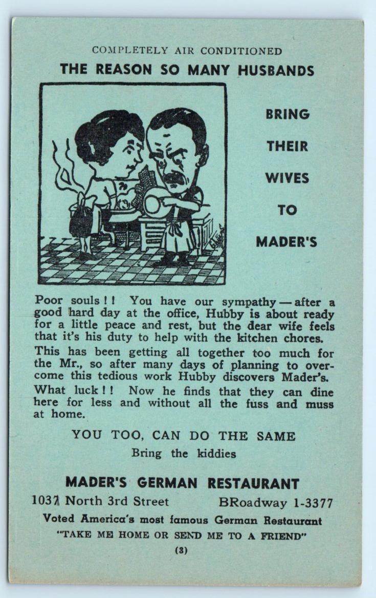 MILWAUKEE, WI ~ Roadside MADER'S German RESTAURANT c1960s Comic Postcard