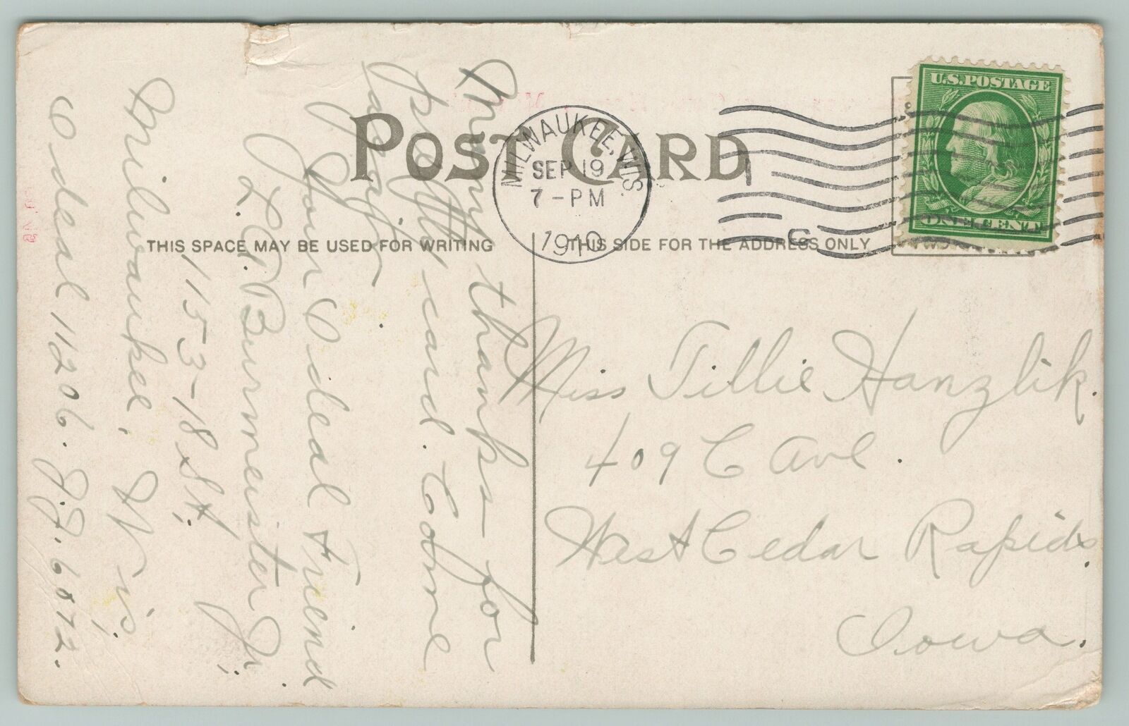 Using the photo magnifier, please examine photos carefully, both front and back, for flaws. The back will sometimes reveal nicks or bends that you cannot see from the front. Double-click the image for super size photo. Colored lines are from the scanner and are not on the postcard