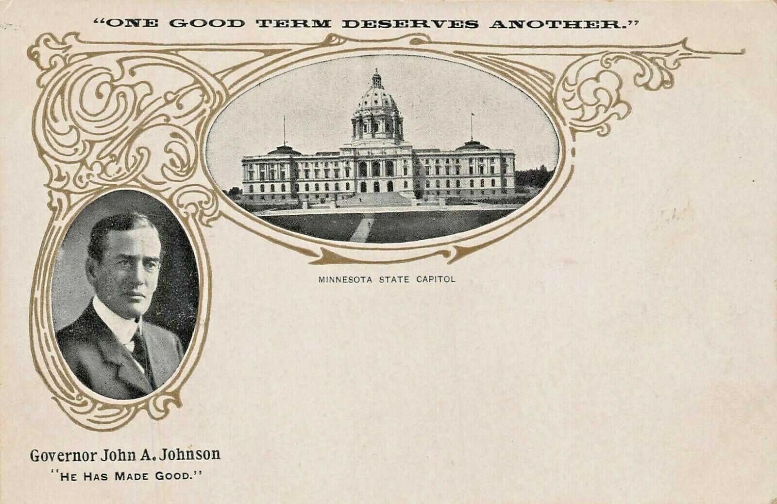 MINNESOTA GOVERNOR JOHN A JOHNSON~ONE GOOD TERM DESERVES ANOTHER~1900s POSTCARD