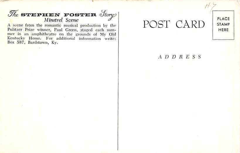 Minstrel scene Bardstown KY Postcard - Unused Grade: 3 Size: R - Regular size: Approx 3 1/2 X 5 1/2 inch (9 cm X 14 cm) Grading Scale: Grade 1 = Perfect corners Grade 2 = Very Minimal corner wear, no creases G ... Read More