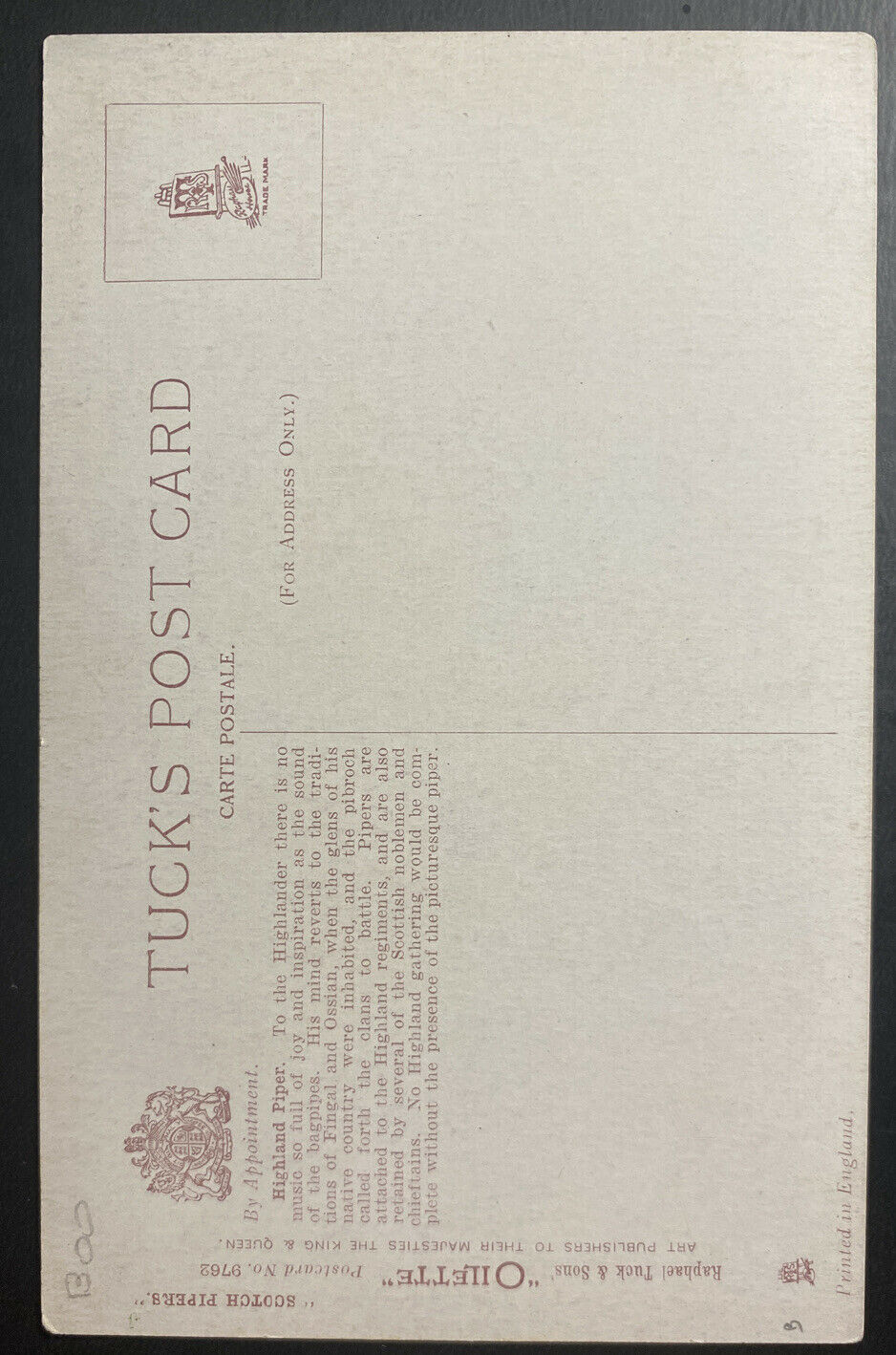 Up for auction is a beautiful picture postcard (PPC) depicting Piper full uniform . In good condition. Nice Postal History . Priced to sell. From England