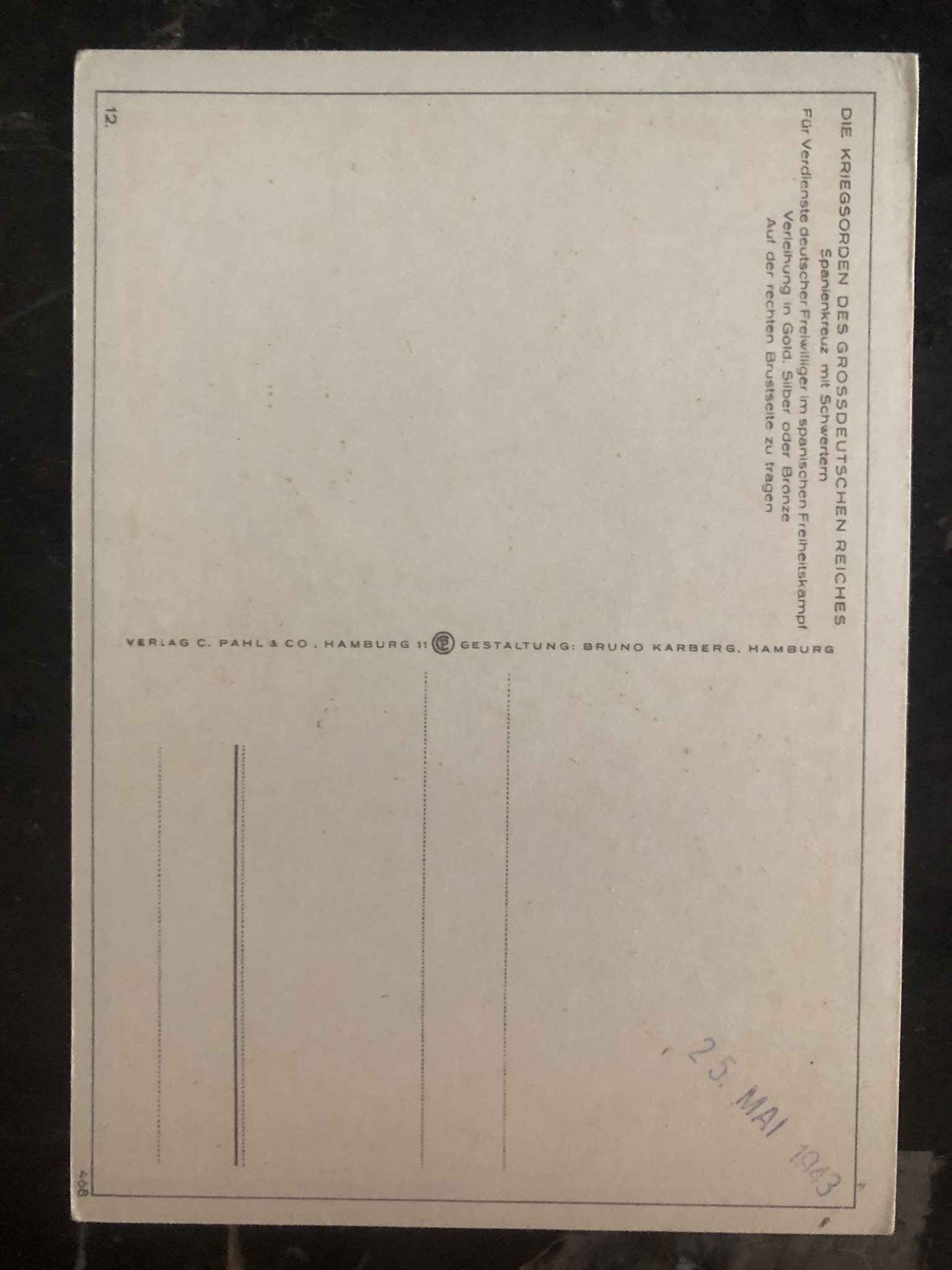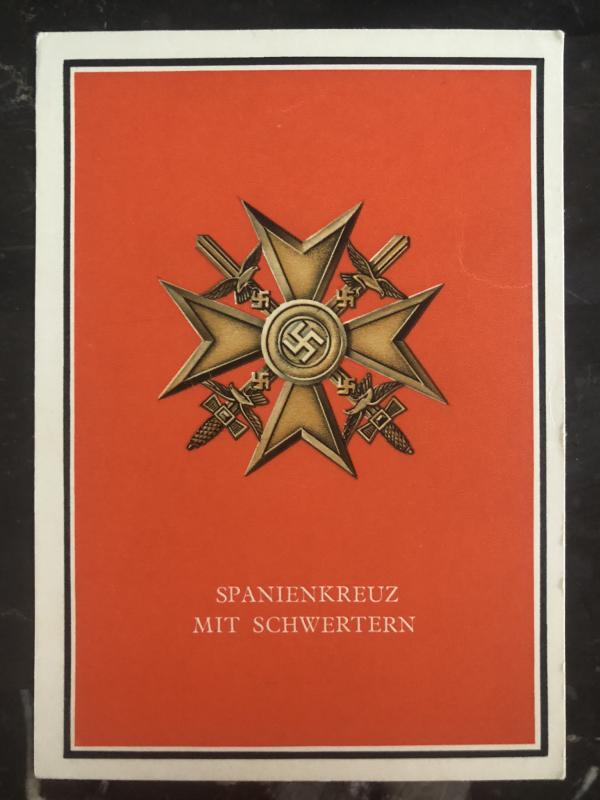 Up for auction is a beautiful Patriotic postcard , From Germany . Postcard commemorating The spain cross with swords. In excellent condition . Priced to sell. Original World war two, WW2 publication. Third Reich.Shipping