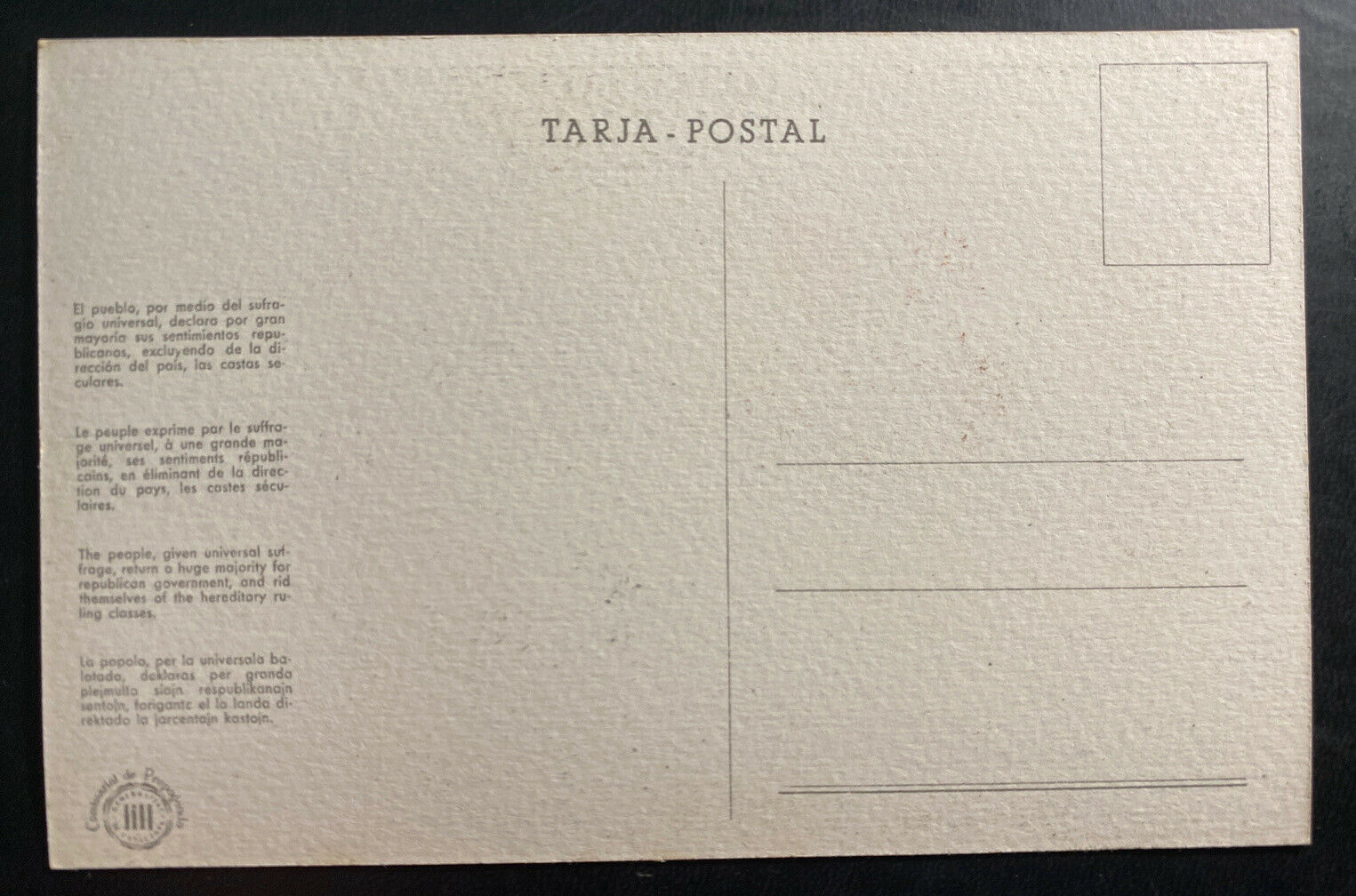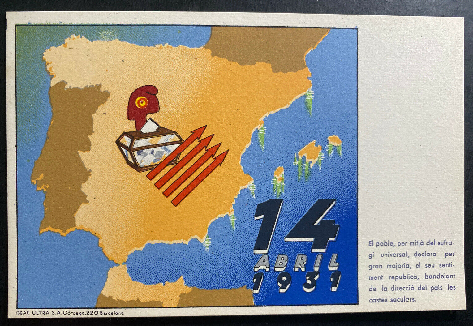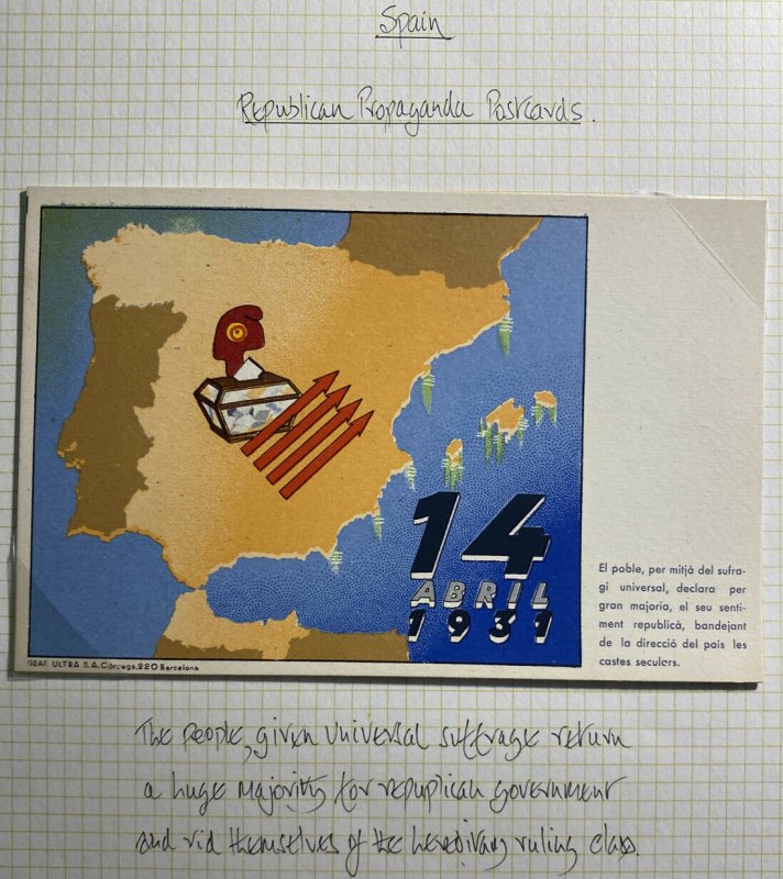 Up for auction is a beautiful mint never used color picture postcard Republican propaganda People Given Universal Suffrage April 14, 1931. In good condition but shows some wear. Priced to sell. From Spain .