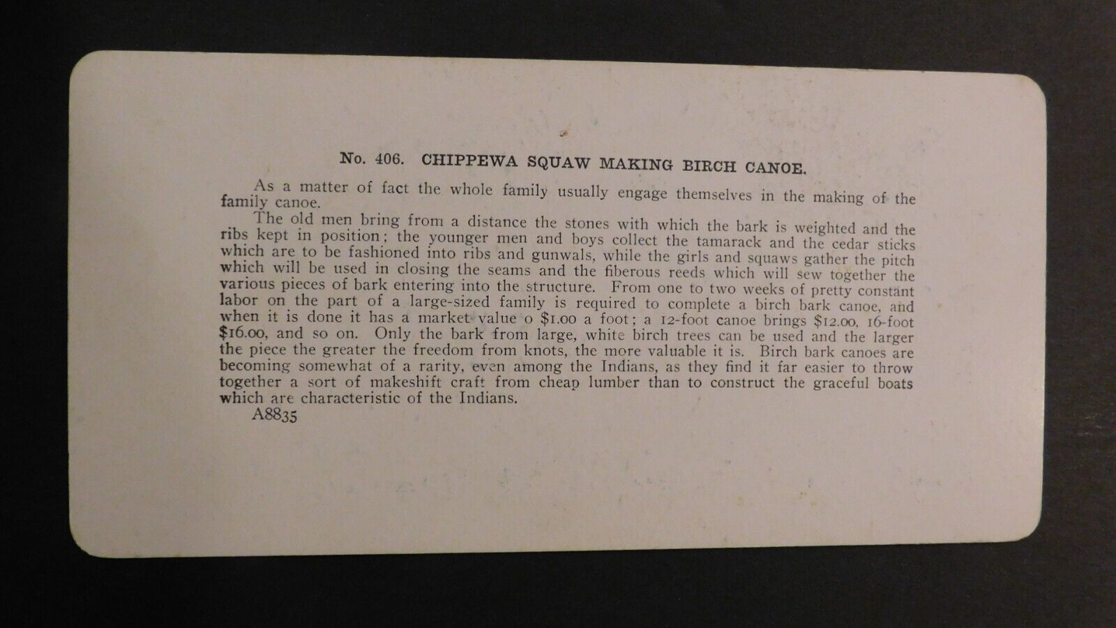 Up for Auction. Priced to Sell. Excellent Condition. Mint PostcardMint Stereo Postcard Native Americans Chippewa Squaw Making Birch Canoe