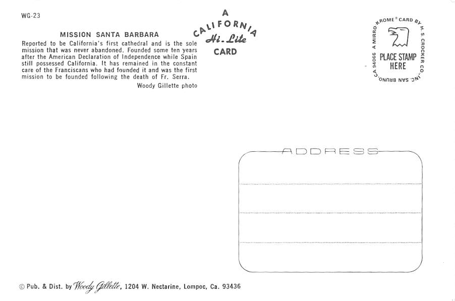 Mission Santa Barbara - California Grade: 1 Category: Continental Size Postcard, Approx 4 in x 6 in (10 cm x 15.25 cm) Product Size: Continental size: 4X6 inches (10.5 cm x 15 cm) Grading Scale: Grade 1 = Perf ... Read More