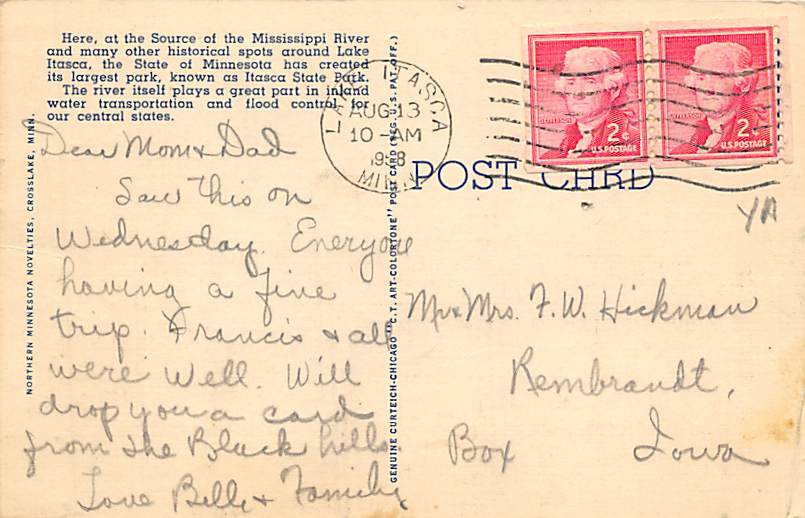 Mississippi River Itasca State Park Itasca State Park, Minnesota MN Postcard - 1958 Grade: 1 Size: R - Regular size: Approx 3 1/2 X 5 1/2 inch (9 cm X 14 cm) Grading Scale: Grade 1 = Perfect corners Grade 2 = ... Read More