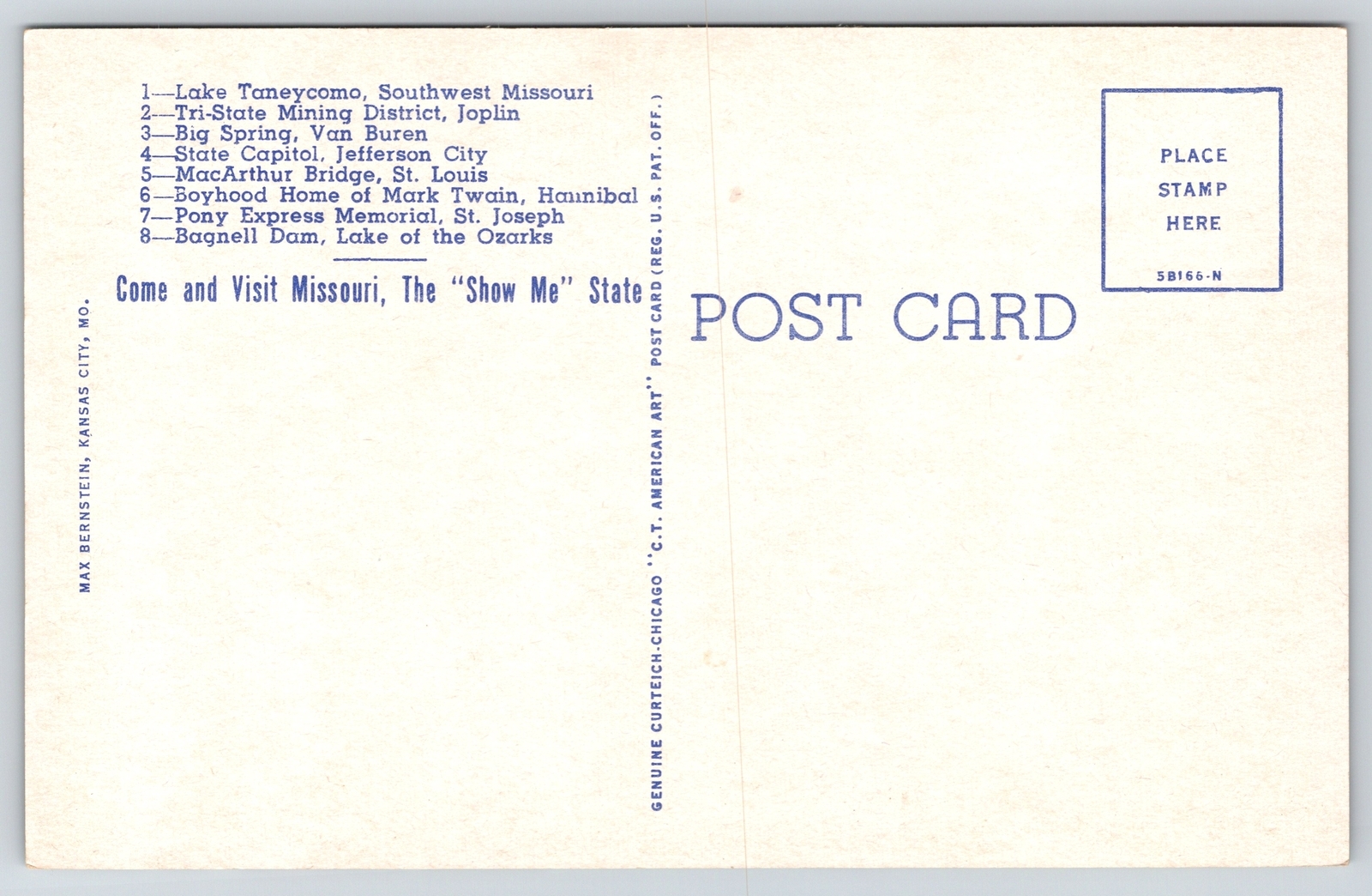 Missouri State Map~Multi-Views~Key On Back~The “Show Me” State~Vintage Postcard