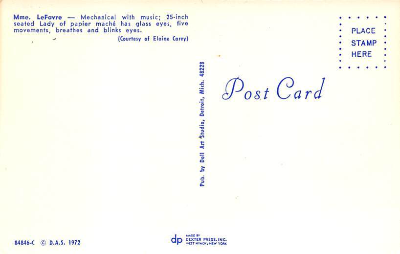 Mme. LeFavre Toy Doll Postcard Unused, Grade: 2, , Size: Regular size: Approx 3 1/2 X 5 1/2 inch (9 cm X 14 cm) Grading Scale: Grade 1 = Perfect corners Grade 2 = Very Minimal corner wear, no creases Grade 3 = ... Read More