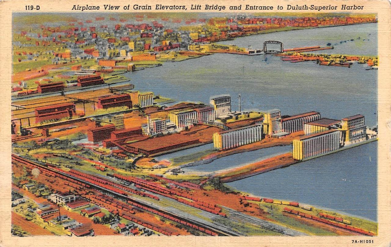 Mn, duluth-superior harbor aerial~grain elevators~lift bridge 1950 postcard