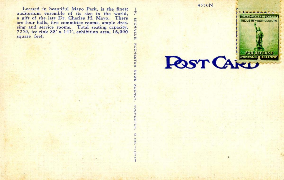 MN - Rochester. Mayo Clinic Auditorium Grading of Postcards MINT (M): Perfect condition, no apparent blemishes, flaws, postally unused, may have some writing on back. NEAR MINT (NM): Like new, image is uncompromis ... Read More