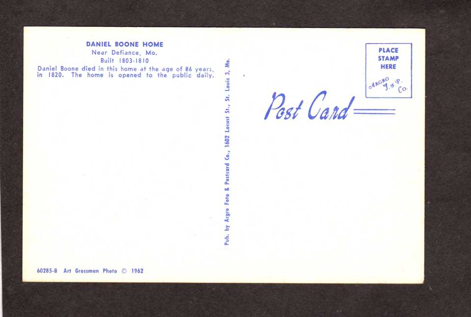 MO Daniel Boone House Home Death nr Defiance Missouri Postcard