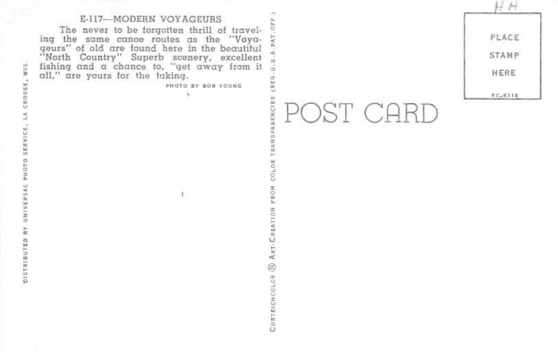 Modern Voyageurs Excellent Fishing Misc WI Grade: 1 Size: Regular Size Postcard - approximately 3 1/2 inch x 5 1/2 inch (9 CM x 14 CM) Grading Scale: Grade 1 = Perfect corners Grade 2 = Very Minimal corner wear ... Read More