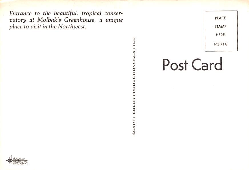 Molbak's Greenhouse & Nursery - Grade: 1 Category: Continental Size Postcard, Approx 4 in x 6 in (10 cm x 15.25 cm) Product Size: Continental size: 4X6 inches (10.5 cm x 15 cm) Grading Scale: Grade 1 = Perfect ... Read More