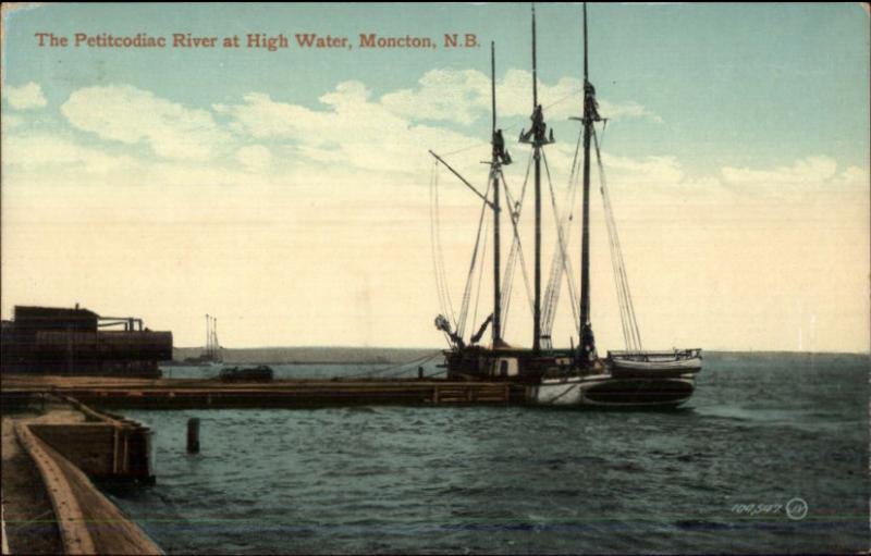 Moncton NB Petitcodiac River at High Water Ship at Dock c1910 Postcard #1