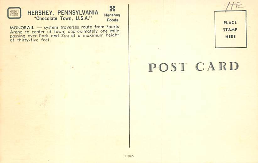 Monorail Hershey, Pennsylvania PA Postcard - Unused Grade: 1 Size: R - Regular Size Postcard - approximately 3 1/2 inch x 5 1/2 inch (9 CM x 14 CM) Grading Scale: Grade 1 = Perfect corners Grade 2 = Very Minima ... Read More