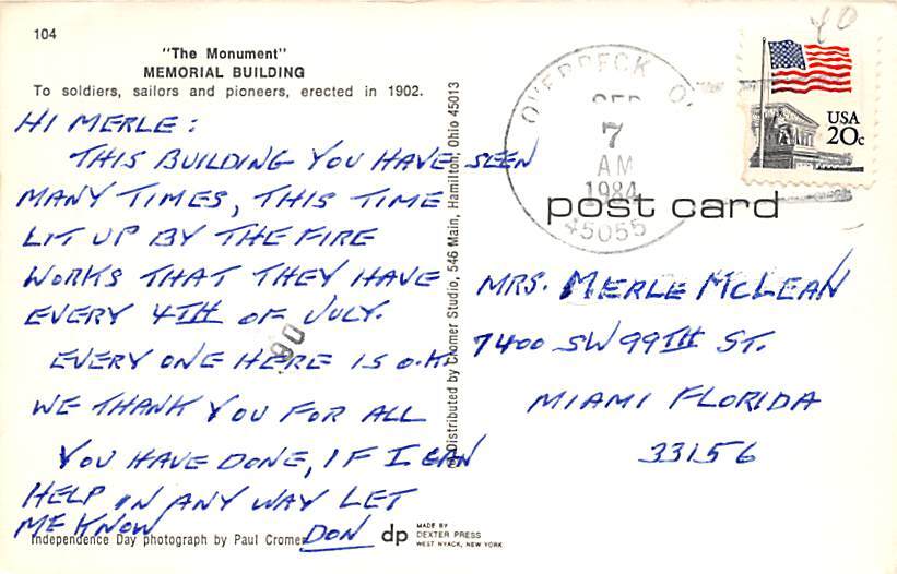 Monument, Memorial Building Hamilton, Ohio OH Postcard - 1984 Grade: 2 Size: R - Regular Size Postcard - approximately 3 1/2 inch x 5 1/2 inch (9 CM x 14 CM) Grading Scale: Grade 1 = Perfect corners Grade 2 = V ... Read More