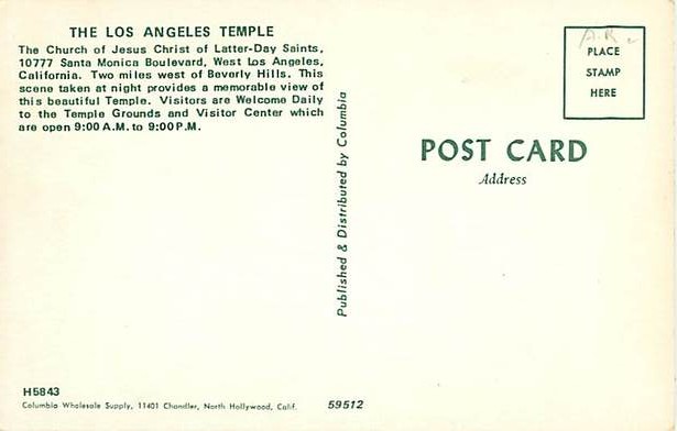 Mormon temple los angeles california ca (church of jesus christ of latter-day saints)Type of Postcard: STANDARD SIZE CHROME