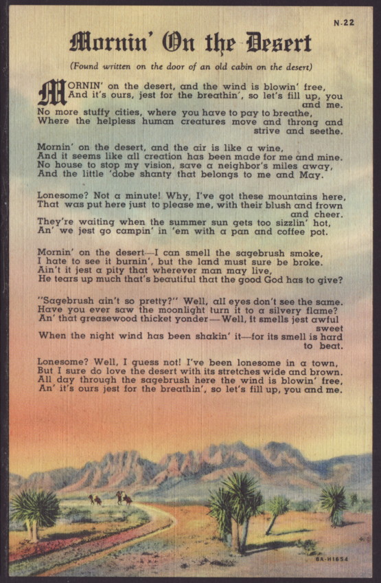 Morning on the Desert Postcard Unused Linen divided back. Near Mint  Grading Terms MINT - Perfect in every way, regardless of age. Rarely seen, may not exist. NM - Near Mint, you have to look closely to ... Read More