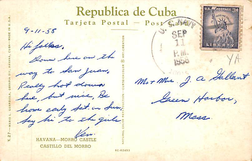 Morro Castle 4 Havana Cuba Postcard Postcard, Grade: 1 Size: Continental Size Postcard - approximately 4 inch X 6 inch (15 CM X 10.5 CM) Grading Scale: Grade 1 = Perfect corners Grade 2 = Very Minimal corner we ... Read More