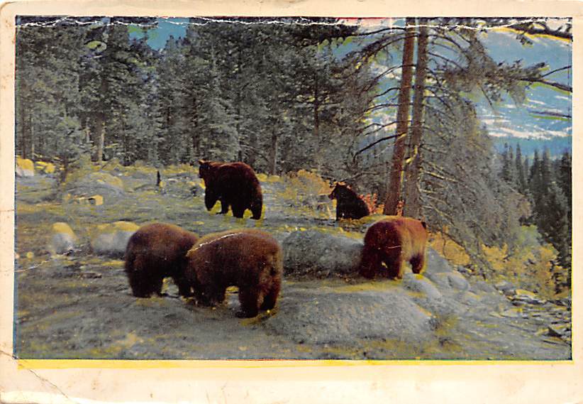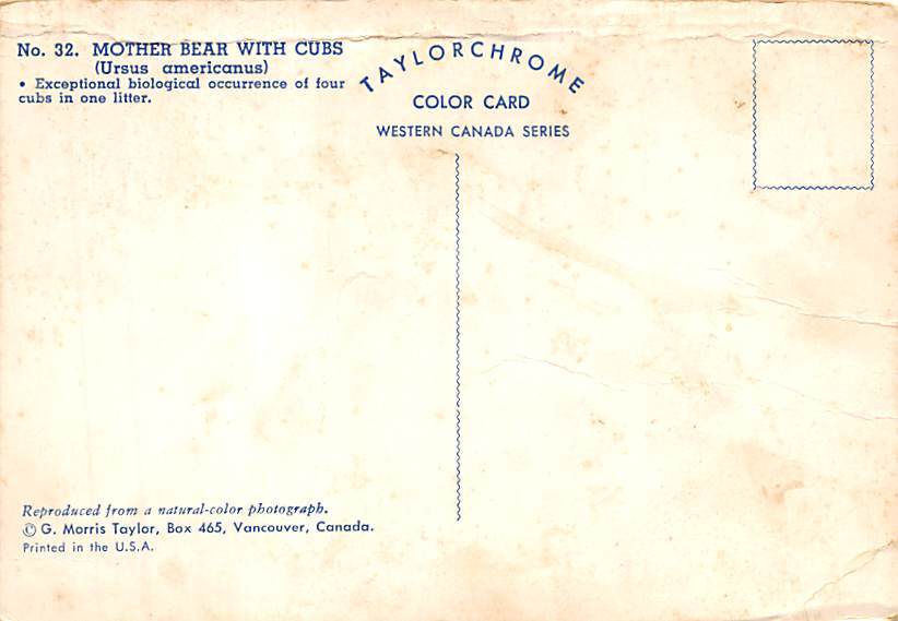 Mother Bear With Cubs, Ursus Americanus Postcard Grade: 5 Size: Continental Size - approximatly 4 Inch x 6 Inch (15 cm x 10.5) Grading Scale: Grade 1 = Perfect corners Grade 2 = Very Minimal corner wear, no cr ... Read More