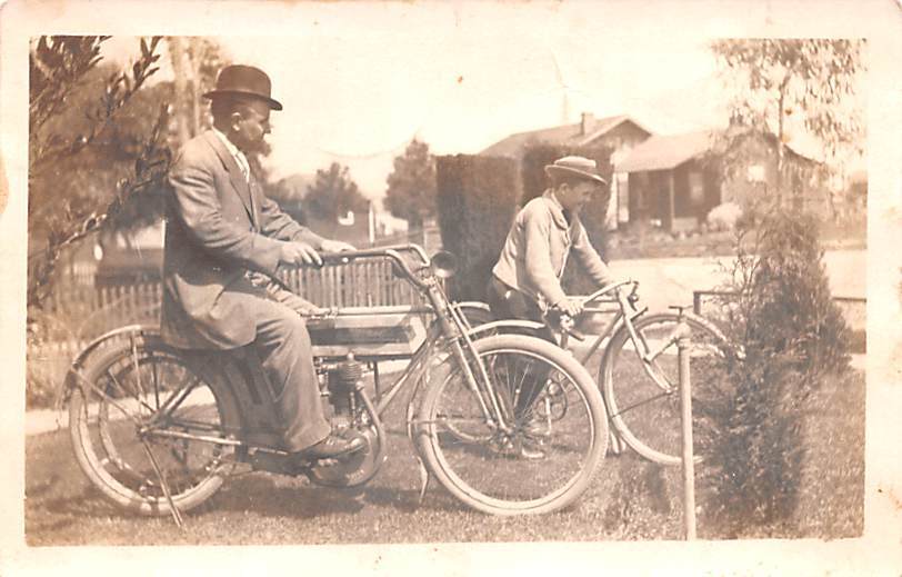 Motorcycle Real Photo Postcards Postal Date: {{Product Field 4 ( Postal Used, Unused)}} Grade: 4 light crease or indentation near top of card, yellowing on back from age Size: Regular Size Postcard - approximat ... Read More